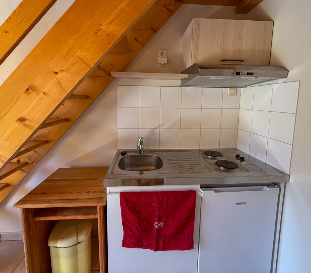 - coin kitchenette, frigo, 2 plaques électriques, hotte, évier, rangements, vaisselle